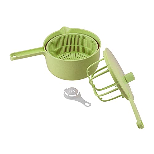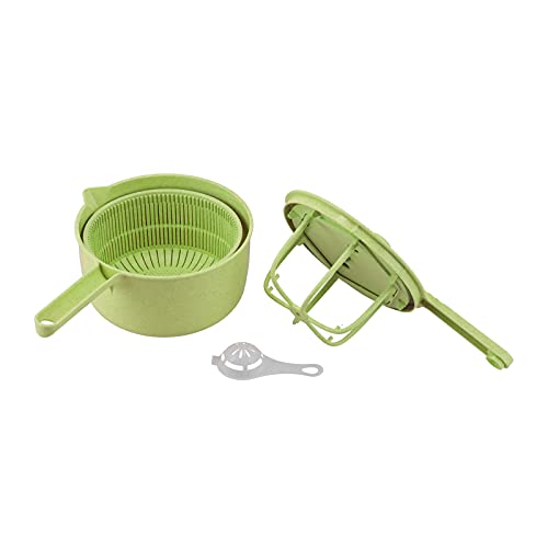 2. De huishoudelijke groentedrogerset bevat een afvoermand, een roerrek, een eierzeef, een deksel en een roerpot.